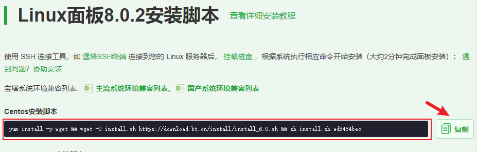 yum install -y wget && wget -O install.sh https://download.bt.cn/install/install_6.0.sh && sh install.sh ed8484bec6. 执行命令